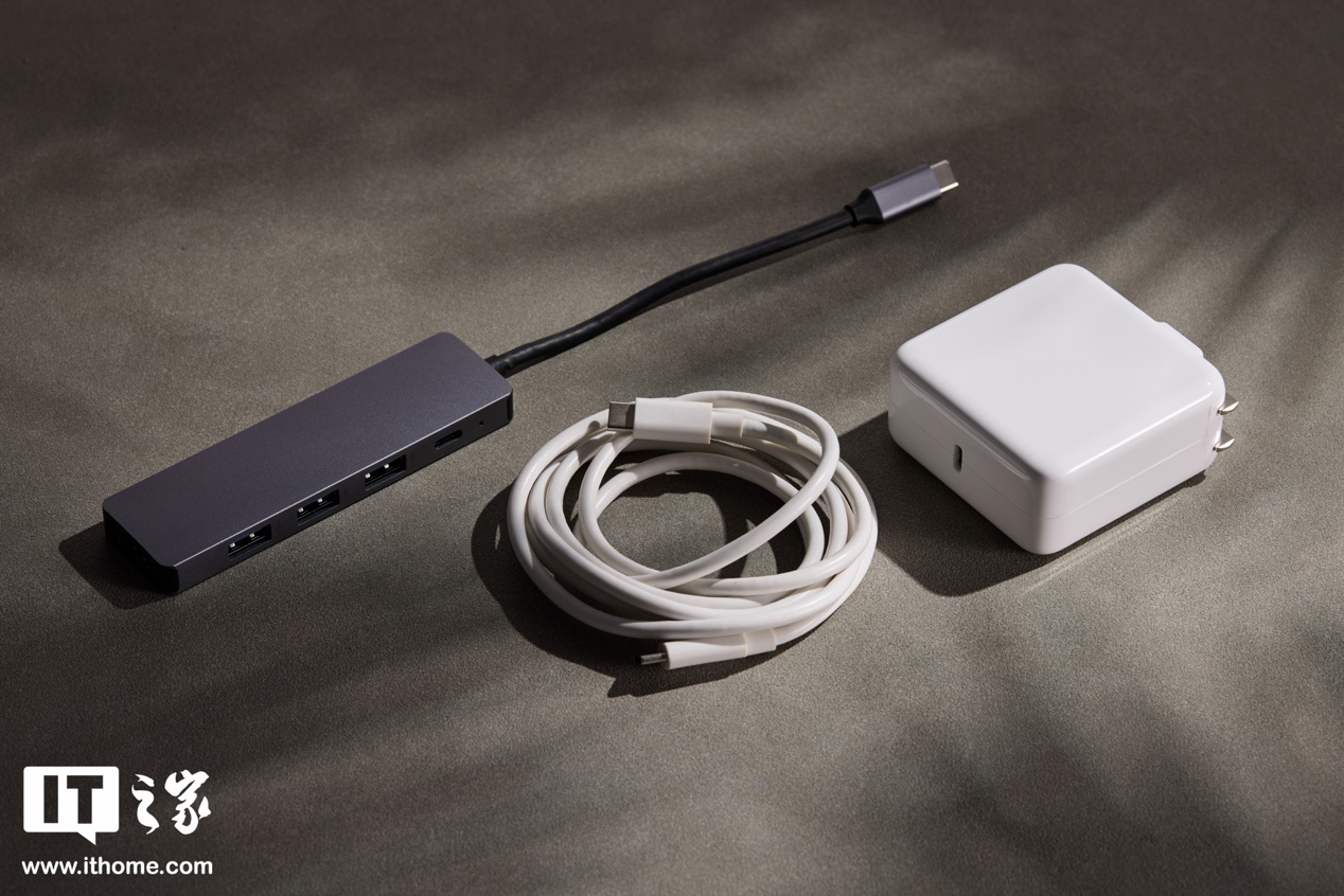 配件选择也贯彻了实用主义,除电脑本体外包装内附有一个 C 口的 100W PD 方形白色电源适配器,一根双 C 口白色电源线以及深灰色的五合一扩展坞。