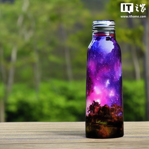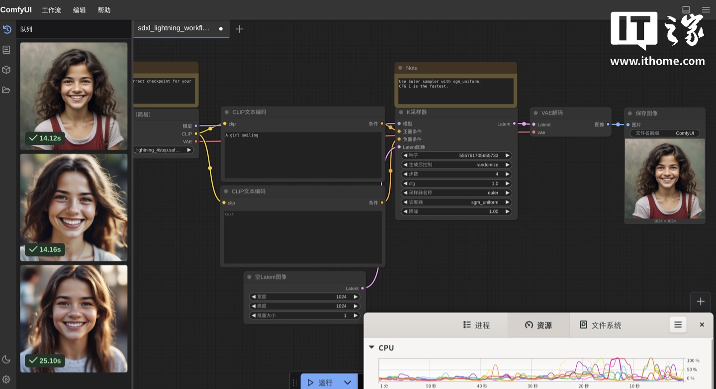 选择模型后会自动提示下载缺失的模型,按照提示下载即可,下载完成后就可以顺利运行模型了,使用官方提示词进行生成一张 512*512 分辨率的“紫色的星空玻璃瓶”,首次生成耗时 36 秒,后续生成仅需要 10 秒左右,在生成的时候,从资源监视器中也能够看到处理器的负载迅速拉满。