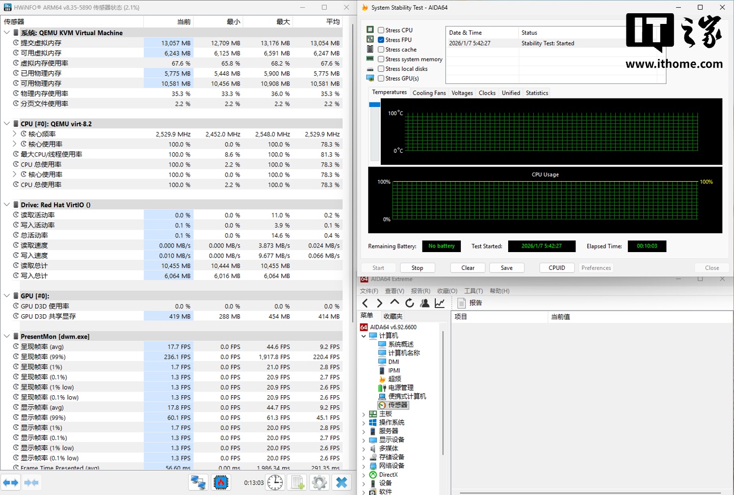 随后,IT之家也对 MTT AIBOOK 进行了 10 分钟的 FPU 单烤,不过由于其采用了全新的处理器,因此 Windows 上常用的 HWiNFO 和 AIDA64 都还无法检测处理器的完整参数,在 10 分钟单烤后,CPU 的核心频率稳定在了 2529Mhz。