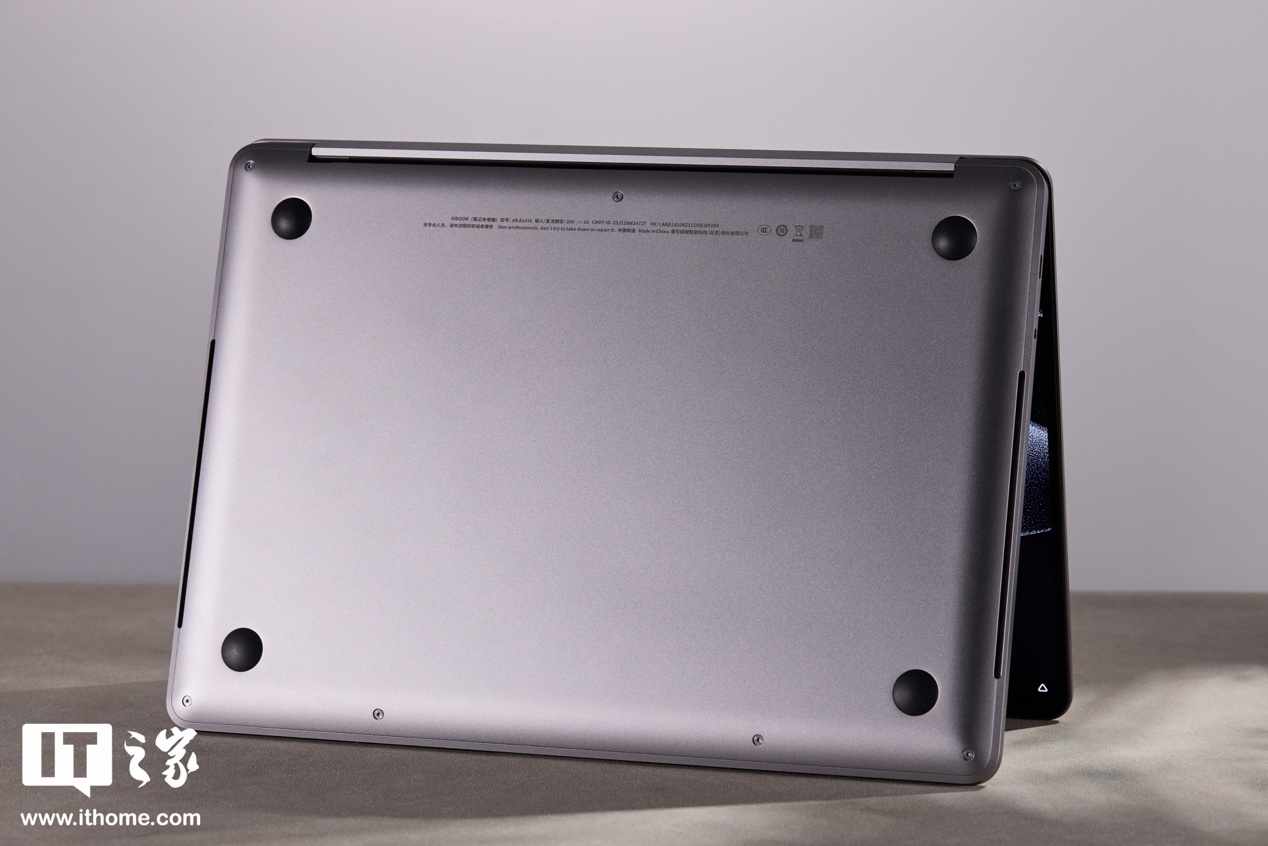 笔记本的背面设计同样简约,后侧隐藏式出风口,以及两侧隐藏式进风口,整齐的螺丝和圆形黑色脚垫,顶部居中位置还有一些产品认证标识和说明信息。