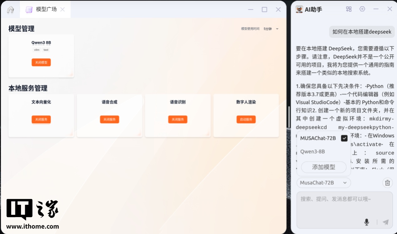 3. 本地知识库:你的私密 AI 资料分析师作为强调 AI 赋能的操作系统,AI OS 中自然少不了时下最热门的 AI 助手,系统自带的 AI 助手无需配置,打开即可使用,默认采用 MusaChat-72B 模型。
