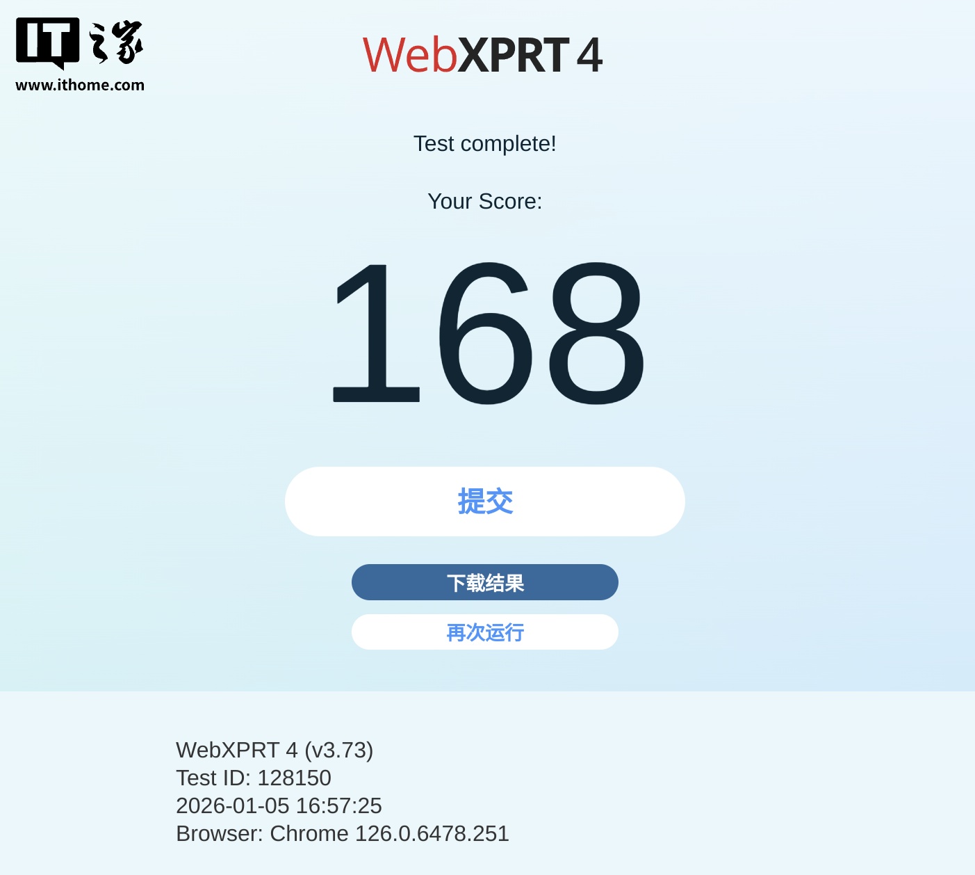 接下来IT之家使用浏览器基准测试程序 WebXPRT4 对 MTT AIBOOK 的 Web 性能进行了测试,它包含基于 HTML5、JavaScript 和 WebAssembly 的场景,旨在反映用户日常使用环境涉及的任务。最终,AIBOOK 测试成绩为 168 分。