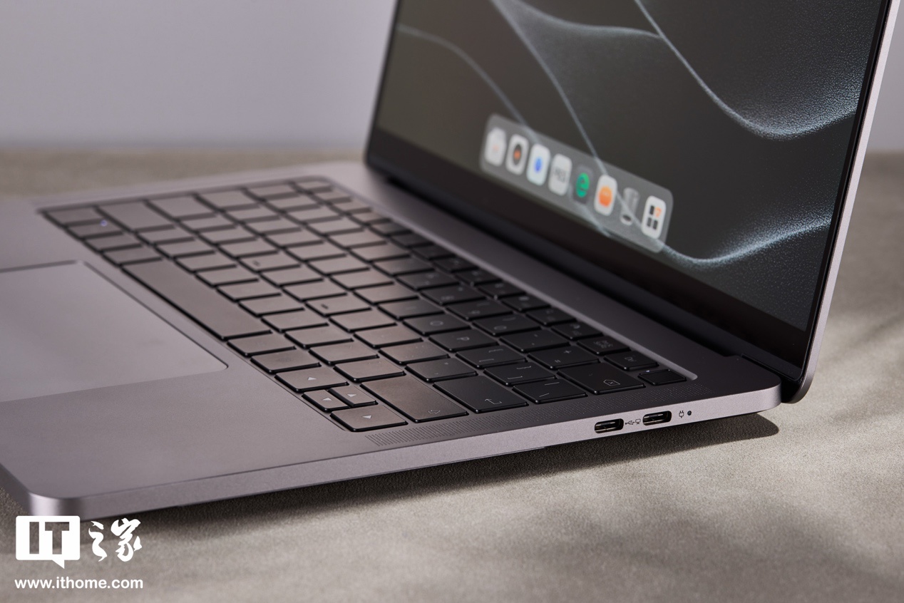 此外,在系统拓展性方面,MTT AIBOOK 机身右侧搭载了两枚全功能 USB Type-C 接口,可以实现供电、数据传输以及连接外部显示器。