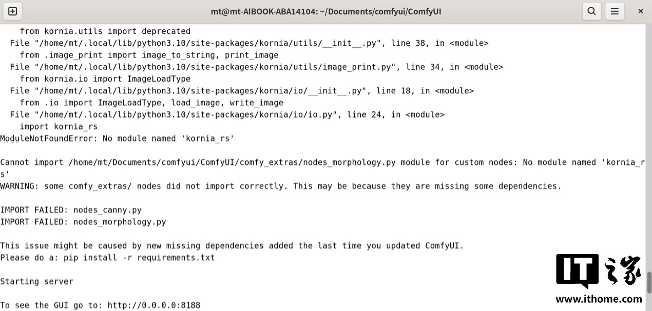 1. 本地运行 ComfyUI:自由构建文生图工作流首先测试的是目前很流行的基于 ComfyUI 的大模型文生图工作流。ComfyUI 的部署对广大开发者来说早已经不是什么难事了,不过考虑到其默认依赖于 NVIDIA 显卡或在 Apple Sillicon 设备上运行,为了能够在全新长江 SoC 的 MTT AIBOOK 上运行,工程师们专门适配了用于 AIOS 的 ComfyUI 版本,下载后,部署方式与常规版本无异,安装相关依赖后,就提示可以到浏览器中打开 GUI 操作了。