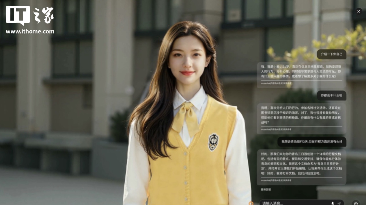 如果不说这是 AI 生成的数字人,大多数人一定无法分辨它的真实性。在日常对话中,小麦的表现十分稳定,还能调用系统功能,比如在对话中说去青岛游玩的攻略还没有头绪,它就能生成一份攻略,并拉起相关 App 将文档呈现出来。