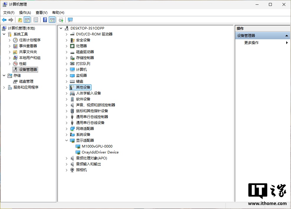 完成安装后,就可以进行 Windows 系统的体验了,首先我们在计算机管理中查看显卡的支持情况,可以看到,已经成功显示 M1000vGPU 了,这也正是 MT AIOS 的一大特点,就是在虚拟机的使用中,可以完整地调用 GPU 功能,实现更好的显示和渲染体验。
